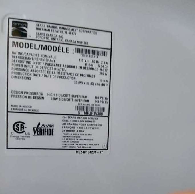 22 cu ft White Kenmore Side-by-Side Refrigerator