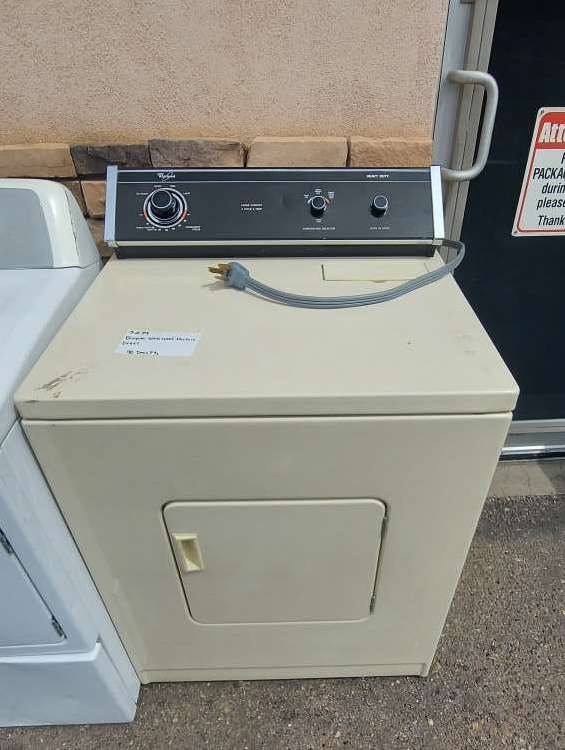 This unit has been tested and works. It has been cleaned inside and out and is ready to be delivered to your home. This unit has 4 drying cycles, 3 drying temperatures, permanent press, fluff air, and has a push to start button. This unit comes with a 90-day parts and labor warranty for the regular price or a 30-day warranty for the sale price from a 5-star business. If interested message me or come on into 5815 Lomas Boulevard Northeast. We accept cash, credit, debit cards and ACIMA no credit payment plan options. We hope to see you in soon!