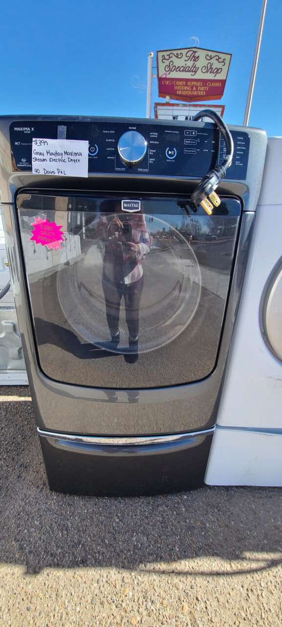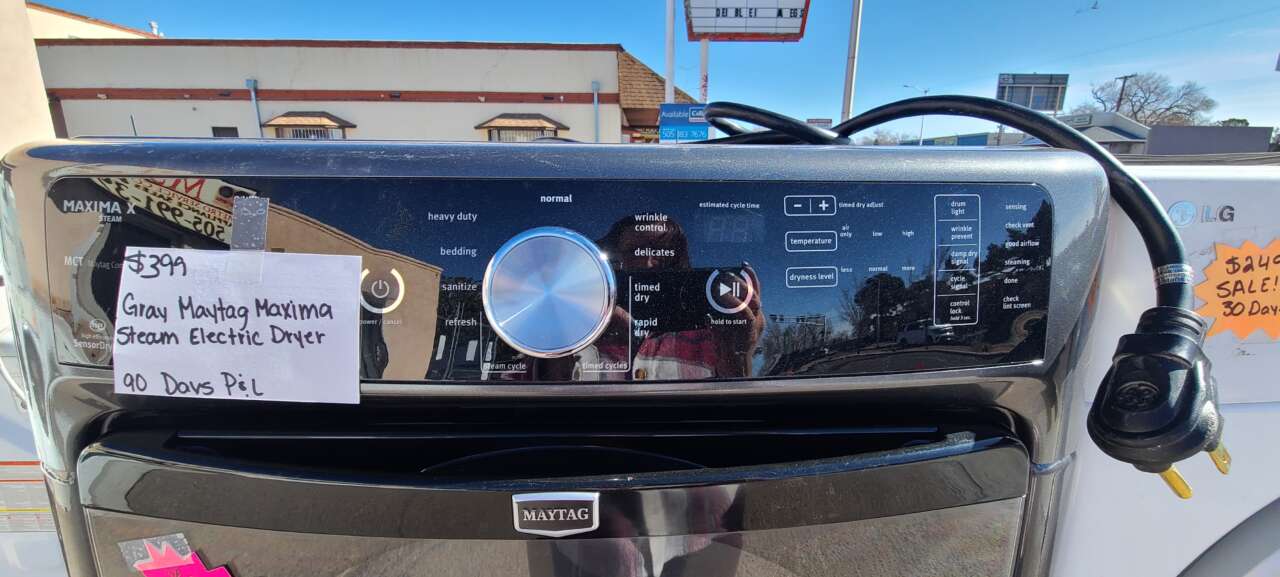 This unit has been cleaned inside and out and is ready to be delivered to your home. This unit comes with, 9 drying cycles, 3 drying temperature, 3 dryness levels, damp signal, wrinkle prevent, drum light, end of cycle signal and control lock. This unit comes with a 90-day parts and labor warranty from a 5-star business. If interested message me or come on into 5815 Lomas Boulevard Northeast. We accept cash, credit, and debit cards and ACIMA no credit payment plan options. We hope to see you in soon!